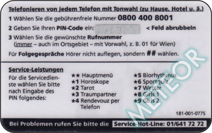 Billiger telefonieren – 100 Meteor-Code: TNS CC001-2Einheiten: 100 öSSonstige Bemerkungen: Karte grau, mit S-Nr.